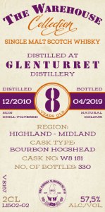 - Glenturret 8 year (Dec 2020 – Apr 2019) Bourbon Hogshead 57.5% – Be a wee bit patient with this one…. to be rewarded with light peat and sweet