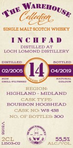- Inchfad (Loch Lomond) 15 year (Feb 2005 – April 2019) Bourbon Hogshead 55.5% – Also give it time to reveal a bit of fruity ginger, honey spice